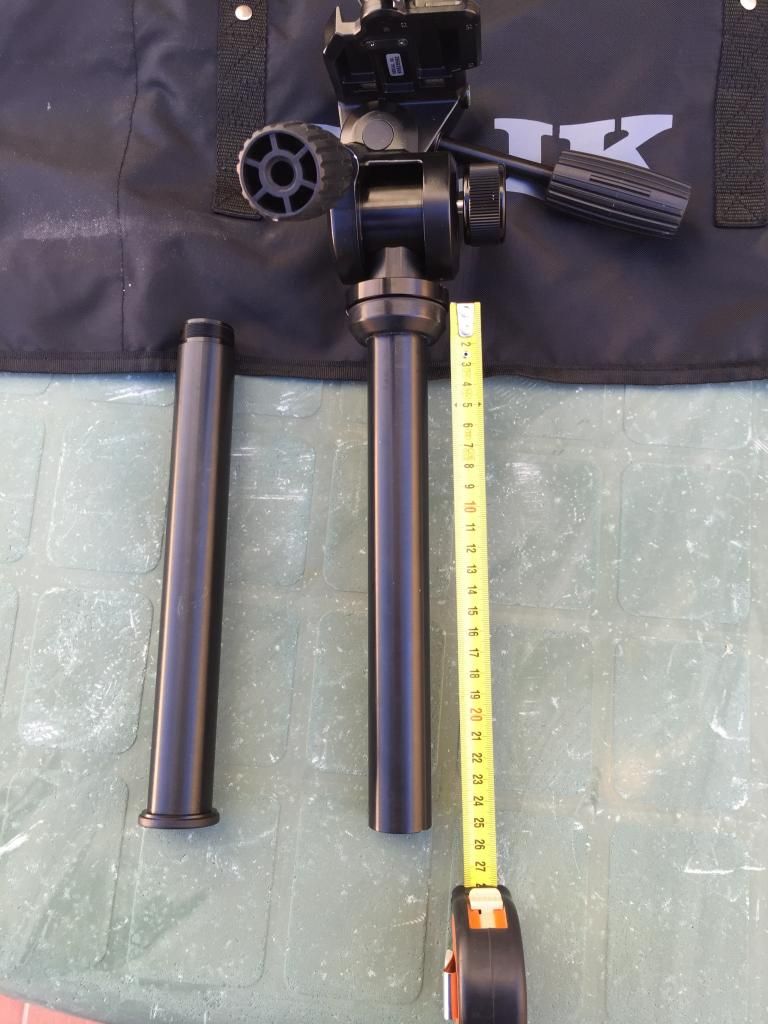 Con las patas plegadas, el tamaño de transporte, ojo , sin rotula, es de unos 67/69cm, y una vez desplegadas sin extender 27cm, extendidas ya nos vamos al 1,70m mas o menos, es bastante alto