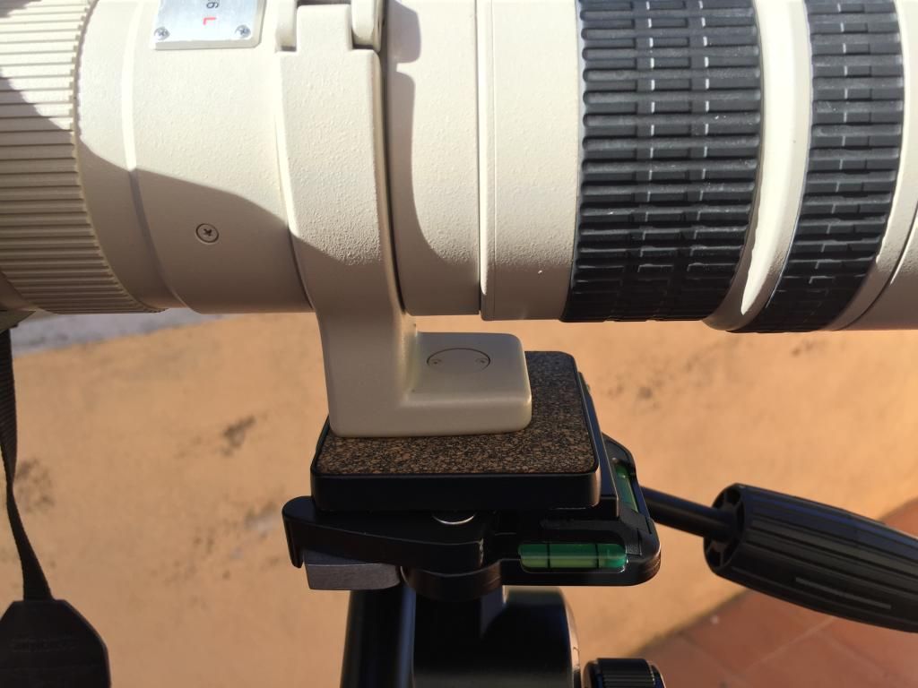 La zapata del QR es enorme, sobresale montada tanto en el 400L como en la Mark III, y como no, su hueco va en concordancia, y la sujeción al mismo, con un seguro, es increíble. Introducción y extracción rapidísimas, y una sujeción de sobresaliente, ni una holgura ni ningún movimiento raro. Existen repuestos de estas zapatas, por si alguien quiere llevar una en cada tele mas una en el cuerpo de la cámara.