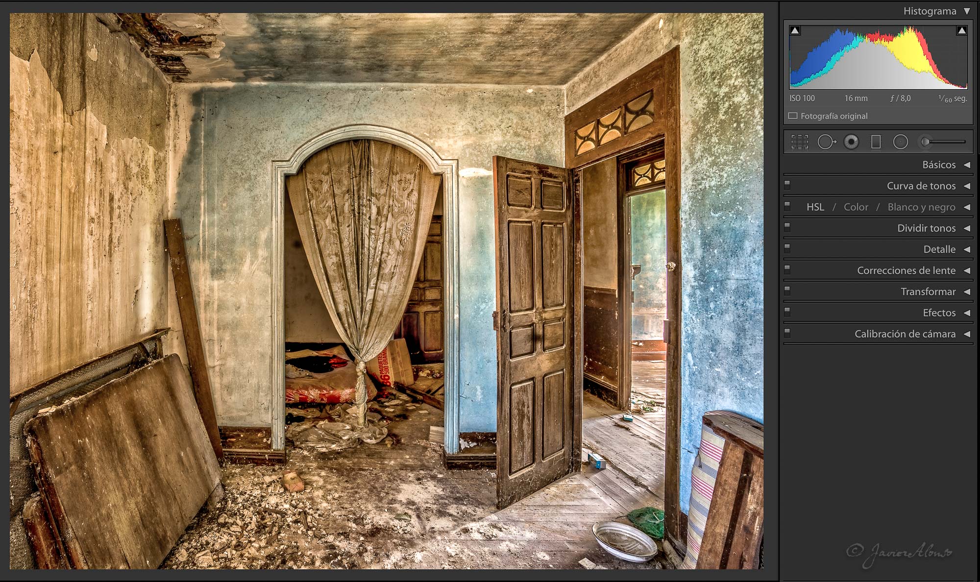 Sí que haría falta un poco más de suelo, pero la verdad, es tan insulso feo y lleno de cascotes y basurillas varias, que no me dio por ahí. Quise sacar el plafón de escayola, aunque también lo dudé. Nos recuerda que ahí hubo vida... y también luz. Lo que sí me apetecía era mostrar el deterioro del techo y el rasgón/intersticio donde se puede, en mayor o menor medida, poder ver el azul del cielo. La pano si fue un poco complicada. Para empezar tuve que trabajar con una versión un tanto pequeña. La grande se iba a algo más de 4 gigas y me daba problemas varios. Una de las cosas que me revientan de Lightroom es que a estas alturas siendo como es hijo de Adobe y por tanto, "pariente" de Photoshop, no admita archivos "PSB". Me parece increíble y lamentable. Pasar de 2 gigas con las cámaras de alta resolución de hoy, es por desgracia demasiado fácil. Sobre todo si es un panorama. Luego la proyección elegida para la pano fue la "rectilinear". A partir de ahí es donde empezó el trabajo de "doma" de perspectivas. Trabajo que todavía tengo que pulir. Si os ha dado por fijaros, la imagen que tengo de esta foto en la galería, tiene el plato casi perfectamente corregido, pero el plafón algo desplazado a la derecha. La que tengo en Flickr y he enseñado en el hilo, tiene centrado del todo o casi dicho plafón, pero el plato está claramente peor. En fin, los que para bien o para mal, somos un poco perfeccionistas, este tipo de cosas no hacen sino que seguir alimentando nuestras "neuras", que no son pocas.