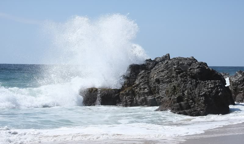 Me gusta ver la fuerza de la ola rompiendo contra la roca. Está muy bien captado el momento. Como detalles a pulir, desde mi punto de vista, yo recortaría algo del cielo, que aporta poco, dejando la línea del horizonte a un tercio del borde superior de la foto. Además, fíjate en que esa misma línea del horizonte está un poco caída hacia la derecha. Las dos cosas tienen fácil arreglo. Lo demás lo veo bastante bien.