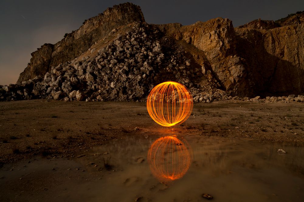 En Photoshop, me he liado, y me he clonado la esfera de luz en varias capas diferentes... Le he cambiado tamaños y la he volteado horizontalmente para que pareciesen esferas distintas, y mediante máscaras de capa las he ido integrando lo mejor que he podido... Con un poco de tiempo habría arreglado la esfera de la derecha, que las piedras que se transparentan no se corresponden con el fondo, pero ahora no puedo, y como no se si iba a poder en otro momento, he dejado ahí esa pequeña chapucilla...