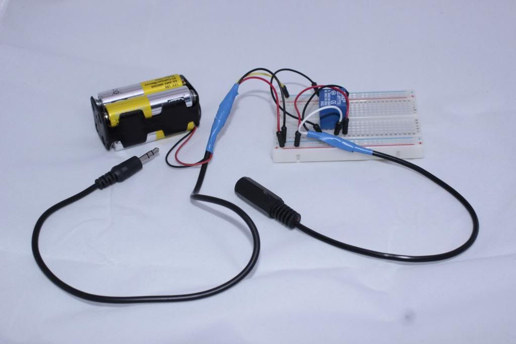 En la siguiente fotografía se muestra el corazón del invento; La cuatro pilas AA, la placa de pruebas y el relé 5v DC... de todo ello se tiene una señal de entrada (Clavija macho que va al sensor) y una señal de salida (Clavija hembra que va a la cámara)