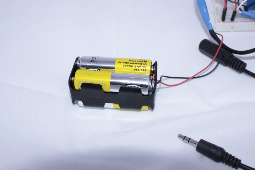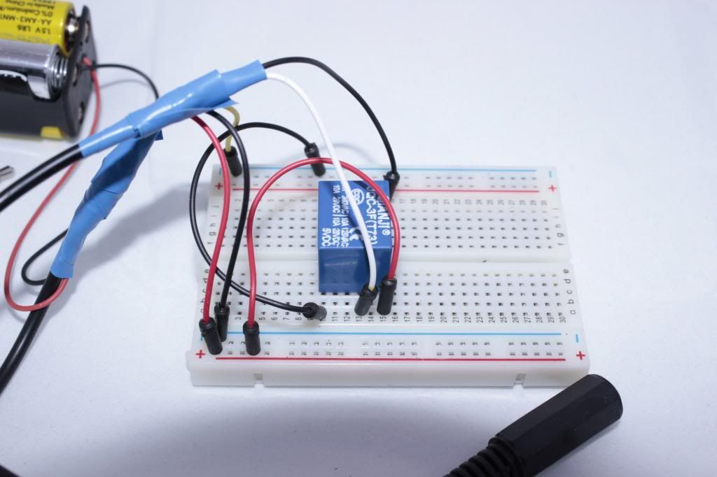 Del housing de las pilas salen dos cables uno rojo (+) y uno negro (-), estos cables hay que conectarlos con los correspondientes rojo y negro del sensor infrarrojo y también llevarlos a la placa de pruebas para que alimenten el relé...