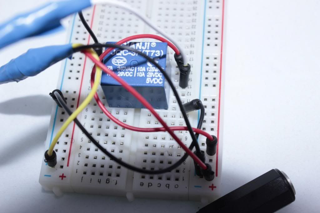 En concreto este es un disparador totalmente eléctrico, y consta de cuatro elementos principales, el sensor de infrarrojos, el housing de las pilas, una protoboard pequeña y un relé con salida NA y NC a 5v...