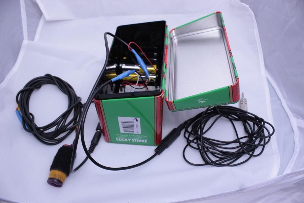 Todo ello se centraliza en una cajita mediana (En mi caso utilizo una de tabaco que rondaba por casa) y empleo dos cables de audio de 3m de largo cada uno para conectar el sensor a la caja de centralización, y otro de la caja de centralización al jack de 2,5mm de la cámara...