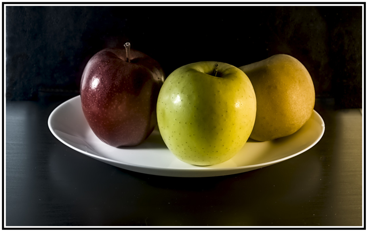 Observo una la luz fantástica, aunque siendo realista, que no cruel, veo que el reflejo sobre la superficie donde se mantiene el plato con respecto a lo ‘ceñido’ del plano por el tercio superior, tiene cierta apariencia volátil, como si los elementos estuvieran en una fase de suspensión. Igual cambiando pelín la composición se podría resolver