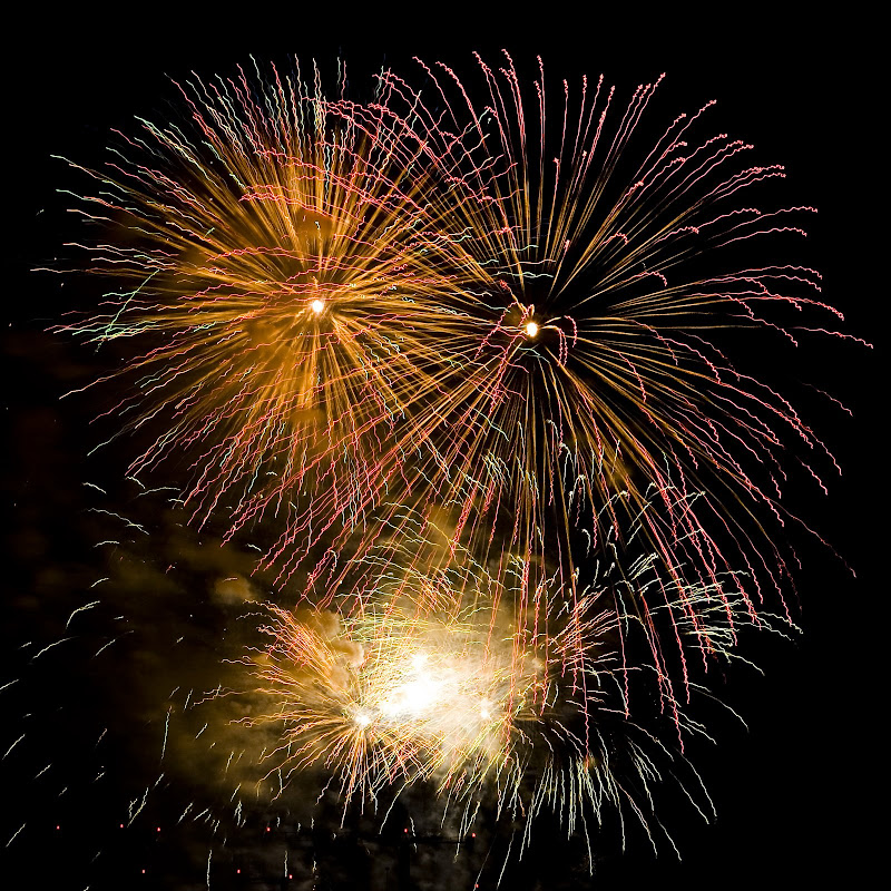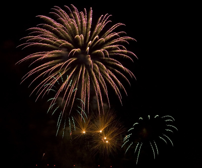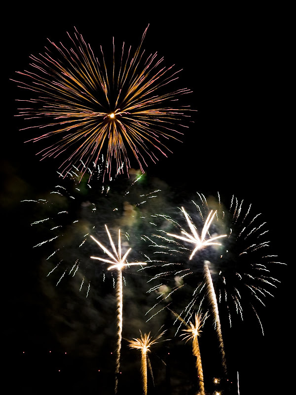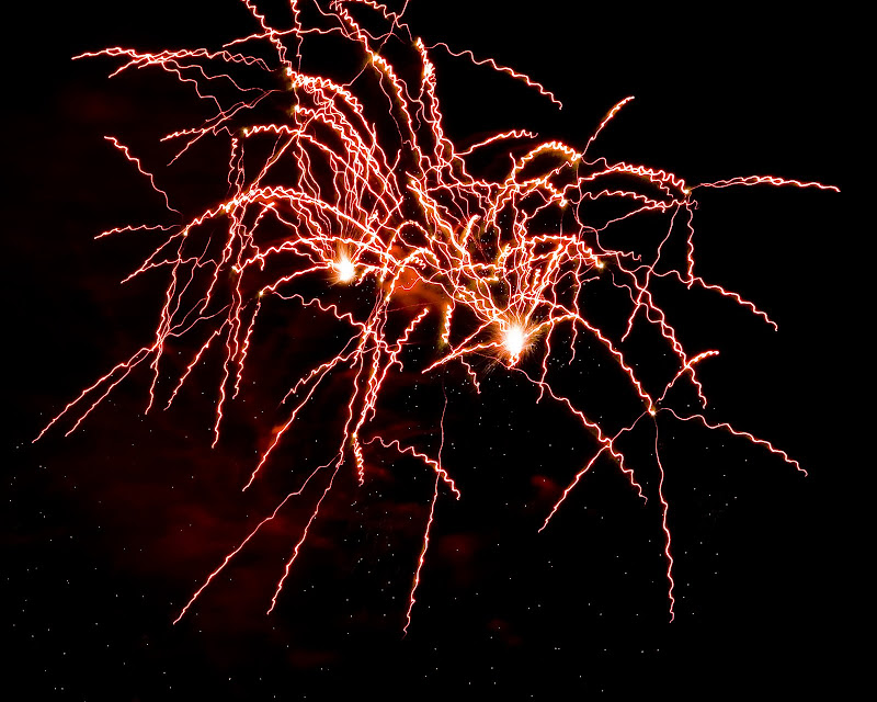 Foto 6: En un arrebato de furia, aumento la exposición a 10 segundos, quizá creyendo en mi locura que eso haría desaparecer a la farola. Todo lo contrario: ésta aparece en toda su gloria y esplendor, recortada contra una acumulación de cohetes que hace que la pirotecnia parezca más bien una bomba nuclear. La farola ríe con gran maldad por todo el daño que ha hecho.