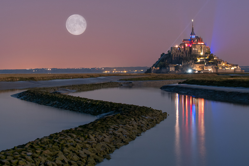 El Mont Saint Michel puede fotografiarse cada día, la luna llena puedes ir a hacerla un día que las condiciones meteorológicas sean ideales en uno de digamos ¿tres días al mes? tampoco tiene que estar al 100% exactamente; tienes los dos ficheros, y cualquiera con mínimo de conocimientos, aunque no sea fotógrafo, puede fusionar las dos imágenes en Photoshop a su gusto colocando la luna a la medida que quiera en cualquier lugar, en seguramente menos de un minuto.