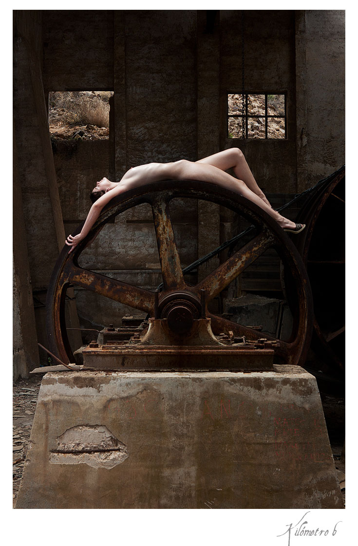 Me gusta seguir las fotos que se suben al foro, y esta semana, cuando he visto la FS me ha dado un escalofrío...primero porque no la había visto hasta que la han puesto en portada y ha sido una sorpresa total, segundo porque me he dicho, que pedazo de foto!!. Podría pasar media hora comentandola....me encanta los contrastes que tiene, y son muchos y variados: lo tosco del lugar con el estilo refinado de la modelo, los colores oscuros, oxidados de la maquinaria, con la piel blanca de la modelo, las aristas y angulos rectos de los elementos arquitectónicos con la plasticidad de la modelo...y como todos esos contrastes se funden ...como lo hacen la modelo y la rueda, casi sin fisuras....y todo esto contemplado por esas dos ventanitas maltrechas que parecen un par de ojos... Me parece realmente genial....
