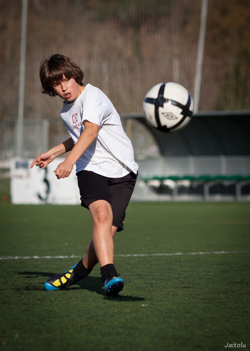 Preparate , apunta y dispara un instante despues del golpeo del balón .Un único disparo. Tienes que conseguir que se vea perfectamente el movimiento del chaval y el balón siguiendo su trayectoria hacia la portería ligeramente desenfocado .