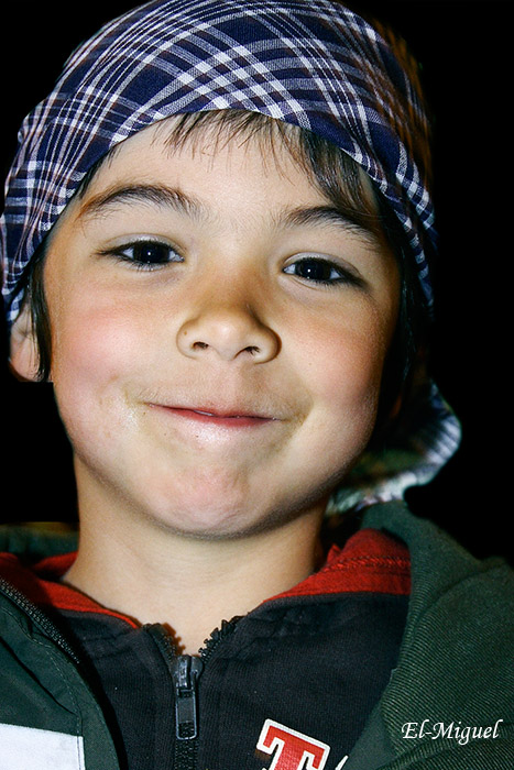 El-Miguel.- Nico con cara de travieso, y con pañuelo de pirata, ja, ja, ja. Una sombra muy fuerte a su izq. y si a los ojos les hubieras dado algo mas de "luz" hubiera ganado.