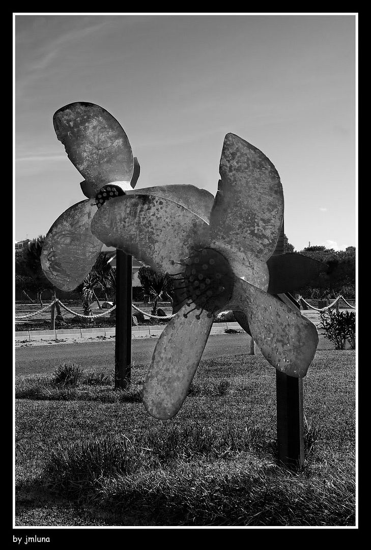 La pase a blanco y negro, porque en color tenia demasiado protagonismo la yerba verde y el cierlo azul. Como las helices eran grises y blaquecinas tampoco me funcionaba el efecto de solo dejarle el color a ellas.