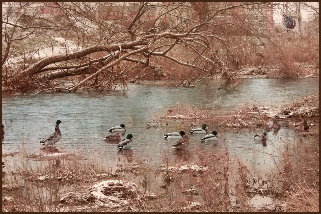 Ya que los edificios estropean el fondo, quizas seria preferible un plano más cerrado centrandose en un grupo pequeño de patos y que se viese mejor el detalle de la nieve.