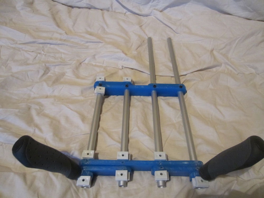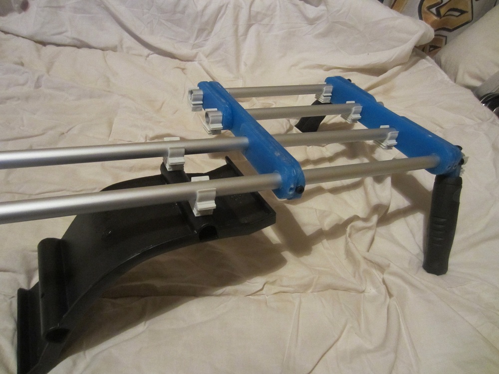 esta hecho con materiales muy sencillos, barras de aluminio muy estables, tornillos de llave allen,sujetadores de tubo. los cuales son muy precisos y dan mucha fijacion , no permite que la base de la camara se mueva tan facilmente a menos que le hagan presion. una tabla de policromato ( tabla de cortar IKEA) la cual si es un poco complicada cortar pero que consiguiendo quien lo haga seria 0 problema, los agujeros son con brocas sencillas y los puede hacer cualquiera. un detalle ' hacerlo a presion y rapido ya que el material de la tabla se calienta un poco en la friccion y hace que se tire a deformar ,manillas de bicicleta corrientes y como pueden ver lo ajuste con tornillos para que sea fijo. en fin el soporte de la camara y la hombrera se pueden mover con precion y ajustarla donde deseen .. si alguien se interesa podria armar otro para vender y con algun color mas neutro -negro-.