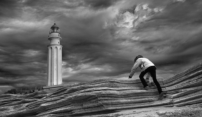 Una foto con una fuerte carga simbólica por la persona escalando, superando las dificultades y con el faro como "objetivo final". El blanco y negro, lo veo muy bien, el cielo se me antoja raro, como pintado.