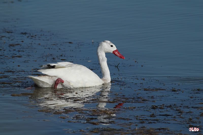 Va un juvenil de coscoroba. En unos meses lucirá un blanco reluciente. Hoy todavía muestra plumas que denotan su inmadurez.