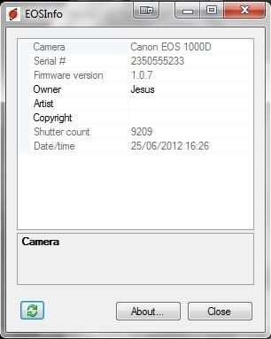 He decidido vender mi querida Milde por que voy adquirir otra cámara y hay que hacer un poco de dinero. A continuación pego la imagen con el EOSInfo. La cámara está impecable, además del cuerpo de la cámara incluyo una tarjeta SD clase 10 y dos baterias adicionales que van perfectas y apenas han tenido uso.