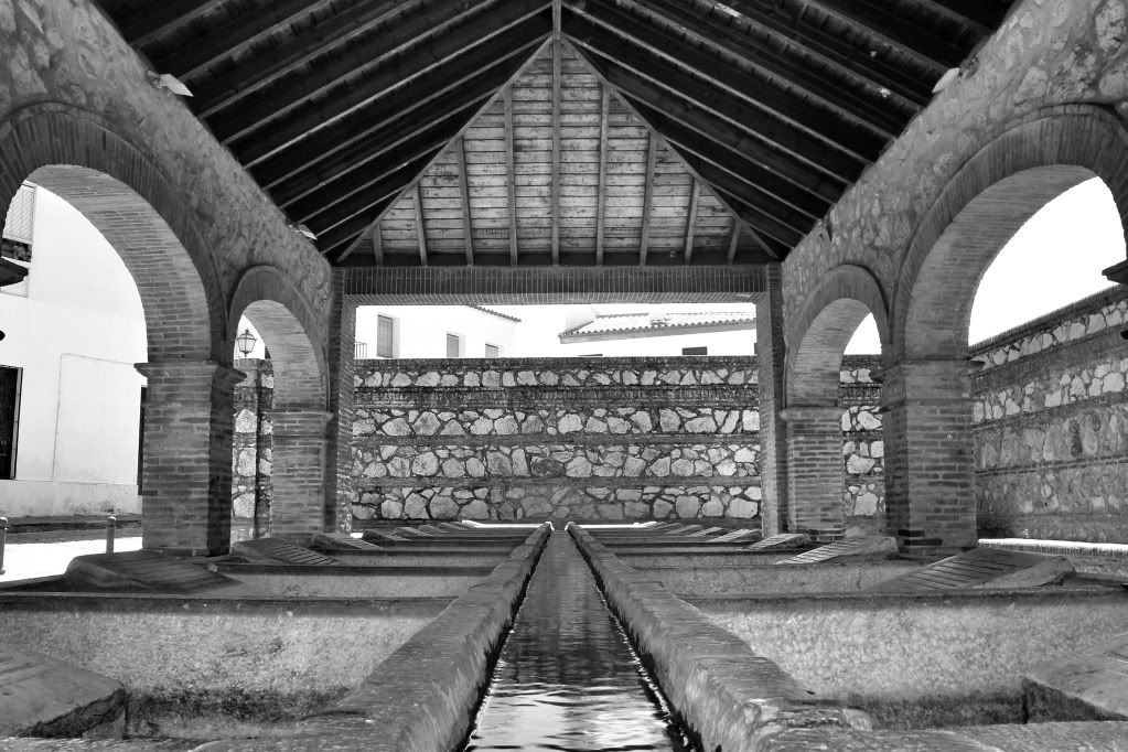 Quizás la luz exterior tan fuerte queda un poco dura, con una luz más tenue quedaría toda la foto con más penumbras y gradaciones. Da la impresión de que has tenido que forzarla un poco para que el interior se vea bien, al estilo HDR. O al revés, podrías intentar quemar completamente el exterior, que no tiene mucho interés, y mostrar mejor el interior. La estructura es bonita, incluso la parte de abajo con los lavaderos, que ahora no se ve casi por la perspectiva, parece tener bastante interés.