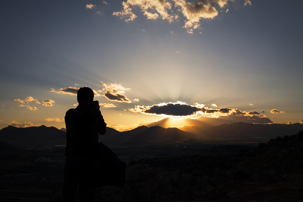 El momento es precioso, con esa puesta de sol preciosa. Sin embargo…….no me queda del todo claro lo que está haciendo el protagonista. Se confunde un poco con la base de la foto y la postura me hace intuir que está tomando una foto, pero la forma de los brazos no me lo desvela del todo. Podría ser que se estuviera comiendo cualquier cosa, o abriendo algo con la boca……….una pena esa indefinición.