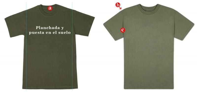 c] la sombra recta de las mangas: os he puesto unas guias en mi camiseta de la izquierda para que veais como la foto que quiere mi cliente esta como plegada para simular una camiseta recta perfecta, no se si ponen un cartón por dentro de la camiseta o no. La verdad que cuando ves la camiseta de la derecha da aspecto de que la talla esta perfecta, mientras que en la mia parece dar mas talla de la que es. Esto a la hora de vender es negativo.