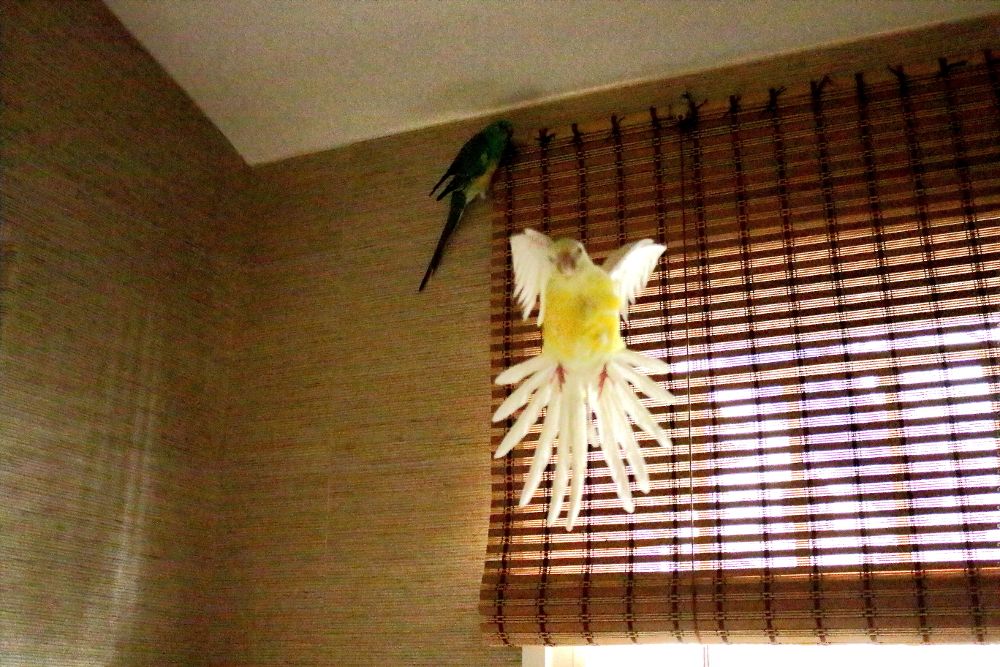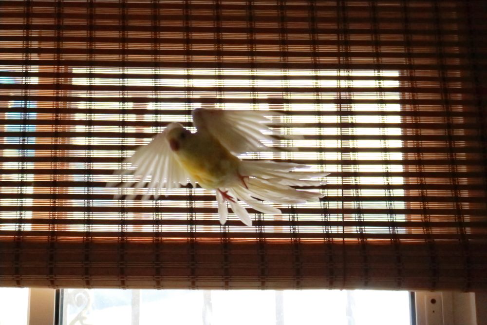 Sube la persiana, y ponte de espaldas a ella. Eso te solucionará gran parte de los problemas de iluminación. Un flash adicional, preferiblemente fuera de la cámara terminará de iluminar correctamente al bicho. Haz una prueba con un peluche para calcular la potencia del flash, no vayas a freir al pajarito. Luego es cuestión de hacer unas cuantas (o muchas) hasta "acertar".