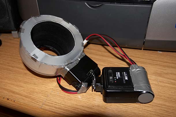 He cortado los cuatro cables (el mío tiene cuatro) y los he alargado con un cable de esos de los altavoces. También le he quitado al flash la tapa amarillenta, para que dé el máximo de luz posible: