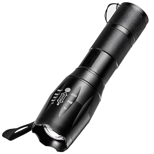 Linterna de gran potencia para tus fotos nocturnas: Linterna LED (900LM) de Mano Resistente al Agua con Batería Recargable y 6 Accesrios Diferentes Ultra Brillante Flashlight de 5 Modos para Ciclismo, Camping, Montañismo, Senderismo y las actividades al aire libre