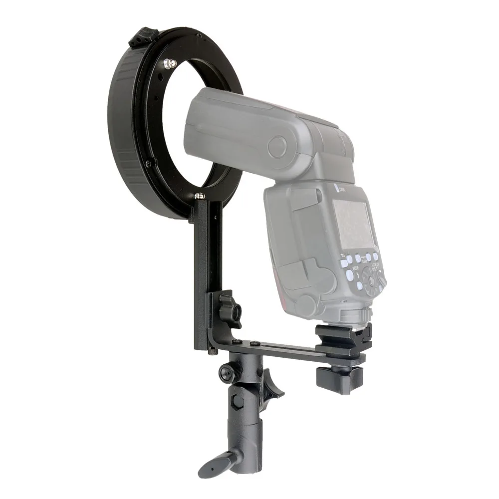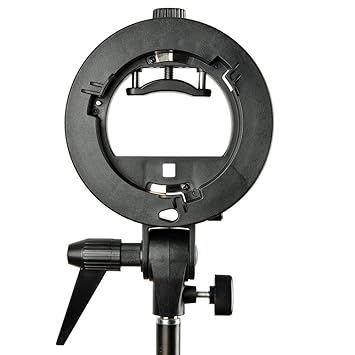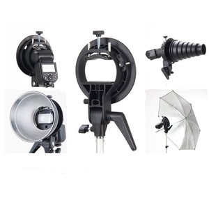 Lo más fácil es usar modificadores Bowens que tienen una boca lo suficientemente ancha para asomar por ella el flash y usar un soporte de este tipo, que cuesta unos 10€ y no necesita ni rótula para ponerlo en un pié de iluminación.